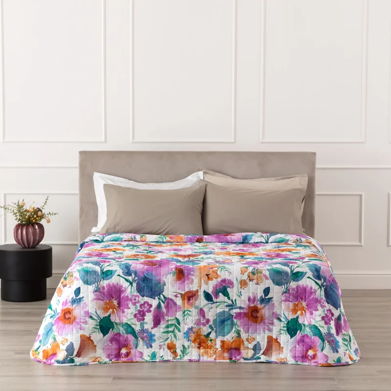 Il quilt matrimoniale Melika unisce estetica contemporanea e comfort quotidiano grazie al fronte in percalle 100% cotone con stampa digitale, che valorizza il disegno floreale con colori profondi e dettagli definiti. Il retro in percalle tinta unita crea un elegante contrasto e rende il quilt versatile. La mano del tessuto è fresca e liscia, tipica del percalle di qualità, apprezzato nell’interior design per il suo equilibrio tra raffinatezza e praticità.