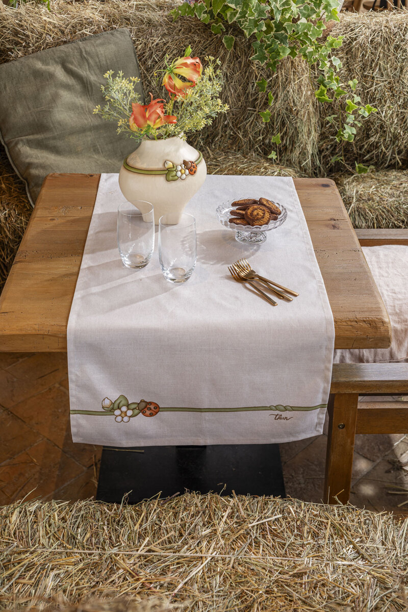 Il runner in cotone Country Bloom di Thun è un elemento decorativo che porta in tavola un tocco di natura e tradizione. La sua semplicità è impreziosita da un delicato motivo con bocciolo, fiore e coccinella, simboli di rinascita e fortuna.