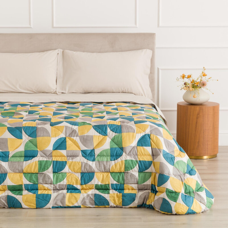 La trapunta ha un'imbottitura da 350 gr in fibra anallergica, trapuntatura a quadri e angoli arrotondati.