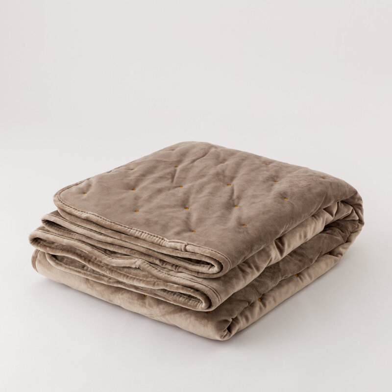 Realizzato con velluto stropicciato sul lato superiore, ha una mano setosa e luminosa che cattura la luce in modo cangiante, creando un effetto dinamico ed elegante. Il retro in ecopelliccia tinta unita, aggiunge una sensazione avvolgente e calda al tatto. L’imbottitura interna da 120 GSM rende questo plaid perfetto per le stagioni intermedie o per scaldarsi nei momenti di relax.